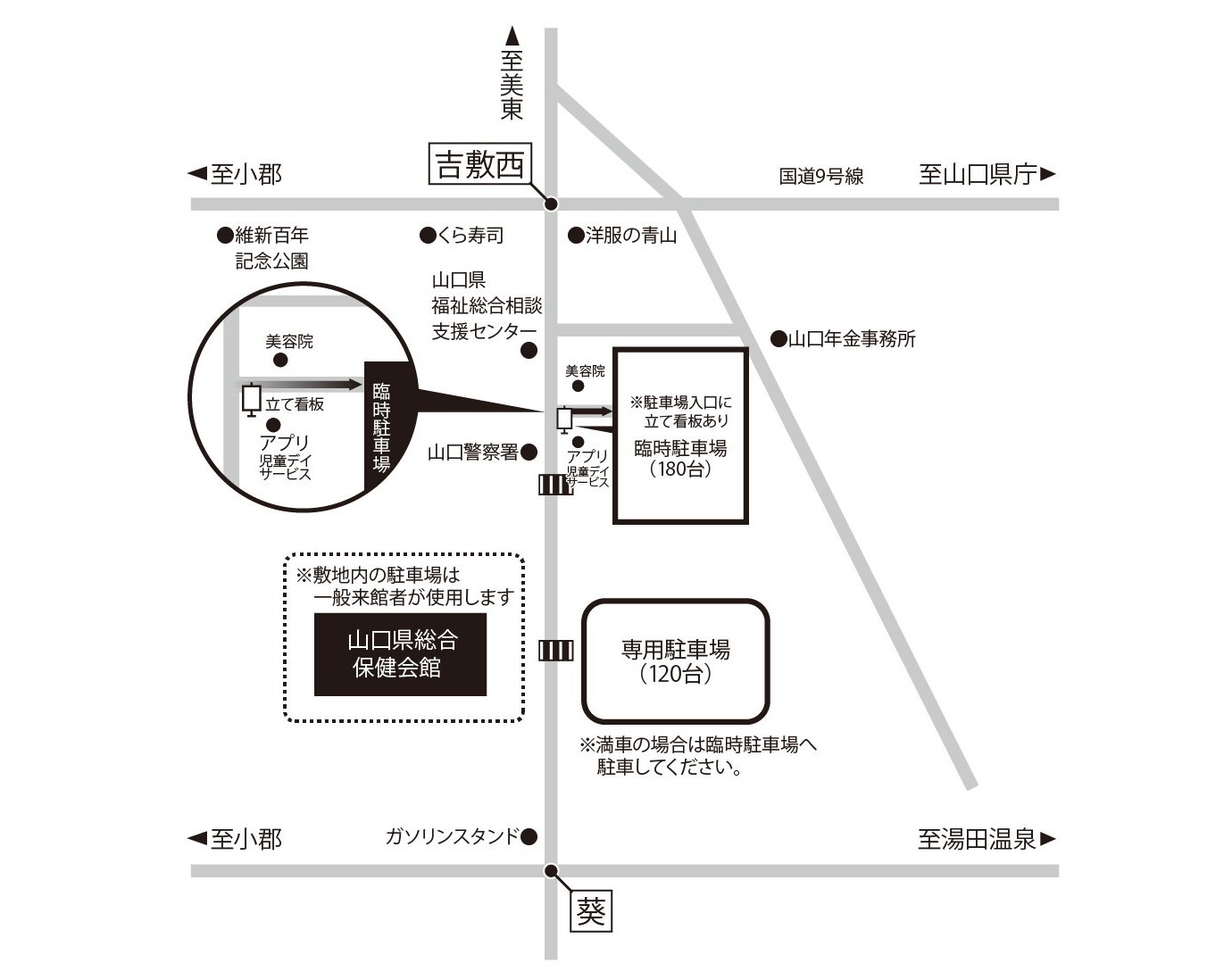 - 大会や研修会の参加者は専用駐車場、又は臨時駐車場をご利用ください。