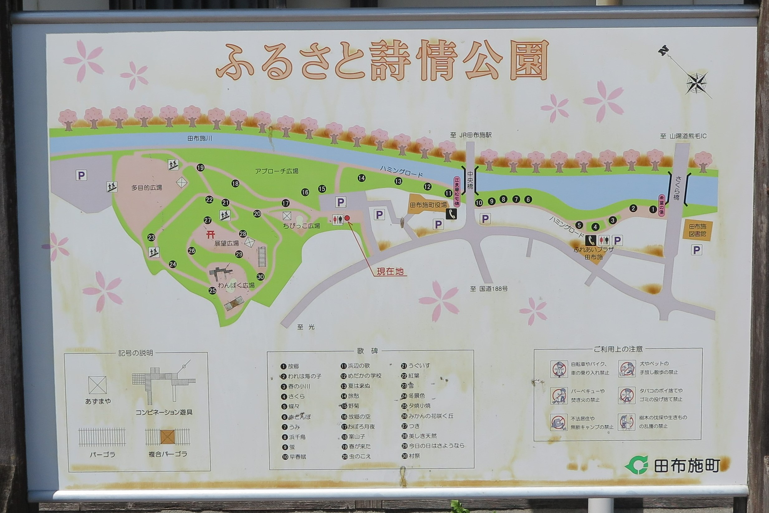 今回は田布施町役場に駐車して、童謡・唱歌の歌碑1番→30番(下図)の順路を歩いてきました。(11番→14番は工事中で立ち入りできませんでした。)
