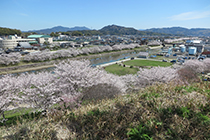 坂を上り切ったところからは田布施町内が一望できます。桜満開のこの日は、田布施川沿いがピンク色に染まり、春にしか見ることのできない特別な景色を楽しむことできました。
