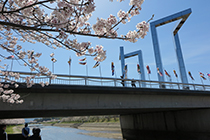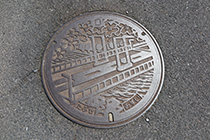 駐車場へ戻る途中に発見したご当地マンホールです。上側に桜の花、中央には特徴的なモニュメントの橋が描かれています。