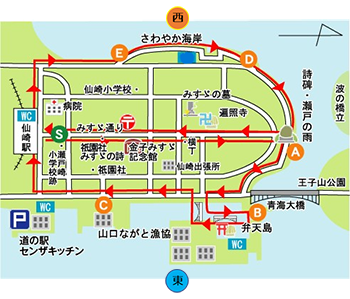 今回取材した、みすゞふれあいコースは、仙崎駅を起点にみすゞ通りを通って、東西2つの周回コースを合わせたような形になっています。比較的平坦な道なので、ウォーキング初心者の私でも無理なく歩くことができました。その日の気分や体調に合わせて、歩く距離を長くしたり短くしたりと、アレンジしやすいコースです。