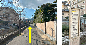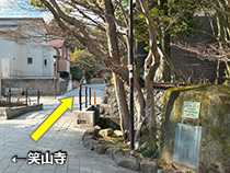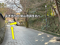 しばらく歩くと右手に橋が見えますが、道なりに左方向へ進み、笑山寺前で右に曲がります。