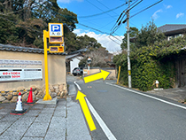 途中、道が2つに分かれているので、右方向に進み、駐車場を通り過ぎて道なりに右方向に歩きます。