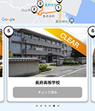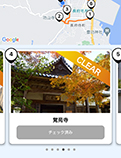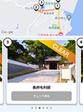 城下町長府の散策拠点である長府観光会館には、無料駐車場やお土産品店があり、レンタサイクルの利用もできます。歩き始める前に、1つ目のチェックポイント「長府観光会館」をチェックインします。タッチ後、表示が[チェック済み]に変われば操作は完了です。