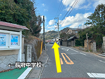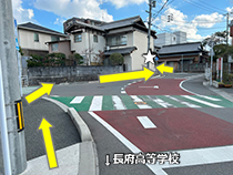 長府高等学校前の通りをさらにまっすぐ進むと、一部の路面が赤く塗られた三叉路に着きました。