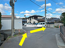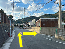 カーブミラーが設置されているところから、右に曲がって細い道に入ります。