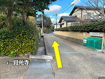 ここはルートがわかりにくいかもしれませんが、曲がり角に次のチェックポイントである「覚苑寺」の案内板が設置してあるので目印にしてみてください。