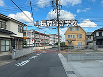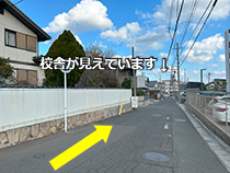 さらに次の三叉路を右に曲がると、前方に次の目的地「長府高等学校」の校舎が見えました。