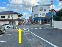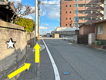 そのまままっすぐ横断歩道を渡って、すぐ左(★)に曲がればあとは国道2号線に出るまでひたすらまっすぐ歩きます。