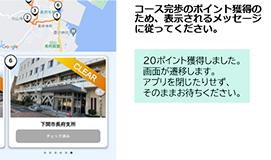 リアルウォークコース機能は、スマートフォンの位置情報機能を活用し、県内に設定された各コースのチェックポイントを、実際に歩いてクリアしながらコース制覇を目指す機能です。コースを制覇すると、ポイントが付与されます。