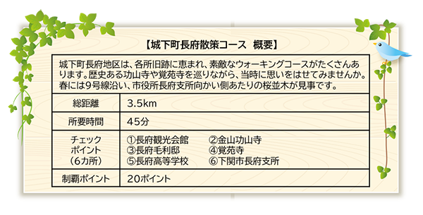 現在14コースが提供されていますが、その中から今回は、長府毛利藩五万石の城下町として栄え、明治維新の舞台にもなった下関市長府の町を歩く「城下町長府散策コース」を歩きました。