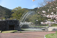 様々な年代の方がそれぞれのペースで過ごせる憩いの場所だと感じました。少し変わった形の噴水があり、その背後の山際にはこれから向かう岩国城が見えました。
