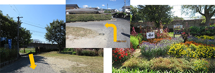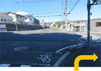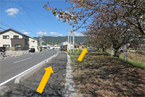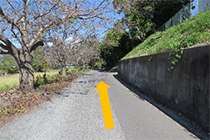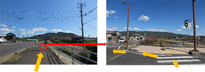 横断歩道を渡り、平成橋まで戻った所で、右に曲がります。すこし歩いたところの分かれ道を左に進みます。([F]地点)