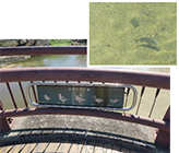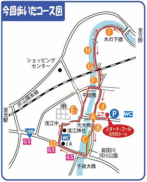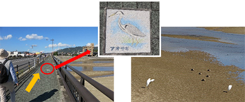 河川公園を後に、浅江神社を目指します。千歳大橋の歩道には、“タイサギ”“アオサギ”などの鳥の絵が埋め込まれていました。橋からも、サギやカモの姿を確認することができました。