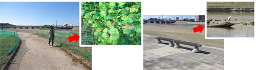 [C]地点河川公園到着です。広い河川敷のあちらこちらに緑のネットで覆われて、苗が育っていました。きっと菜の花でしょう。大切に育てられているのですね。川沿いには桜の木も沢山あったので、春には、ピンクと黄色で華やかになるのでしょう。