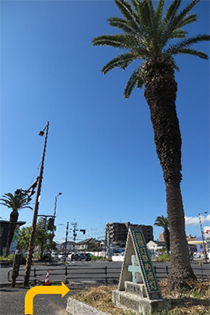 橋を渡って、少し歩くと[D]地点大きなソテツのある交差点に到着しました。