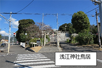 交差点を右に曲がると、遠くに浅江神社の鳥居が見えます。