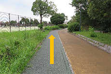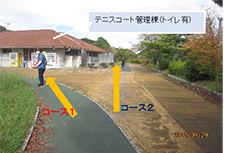 コース1と同じ場所からスタート!テニスコート管理棟を右手に歩きます。