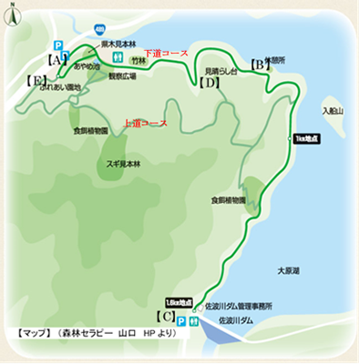 往路は、佐波川ダム管理事務所を目指し、下道(森林セラピーロード)を歩き、復路は上道を歩き、途中見晴らし台に寄って出発地点の駐車場に戻りました。(やまぐちサポートステーションで紹介されているコースは、往路復路共下道(森林セラピーロード)を歩くコースです。)