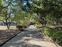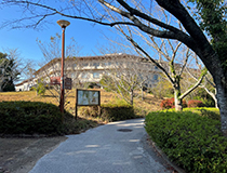 木々に囲まれた道をしばらく上ると、丘の上にホテルが見えてきました。ホテル下を通る道のそばには桜の木が植えられています。春先に訪れて“桜のアーチの中をウォーキング”というのも良いかもしれません。