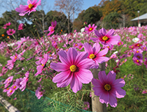 駐車場から管理棟に向かって歩いていくと、前庭に植えられたコスモスが私たちを出迎えてくれました。取材に訪れたこの日は天気も良く、抜けるような青空の下、色とりどりに咲くコスモスがとてもきれいでした。