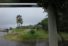 遊歩道沿いは、砂浜もあり、天気が良ければ、水遊びをしている人たちで賑やかなのかな〜?と思いながら歩いていると・・雨がひどくなったので、遊歩道の先端まで歩いて行くのを断念し、藤棚で気持ちばかりの雨宿りをしました。