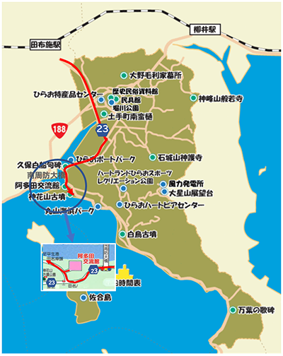 ※下地図:平生町ホームページ(産業課商工観光班)掲載観光マップ(阿多田交流館案内はパンフレットより転写)