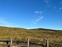 すすきに囲まれた道をどんどん進むと草原の中に妙見原がありました。空の青と台地の緑の対比がとてもきれいでした。剣山からここまで少し早歩きで16分。