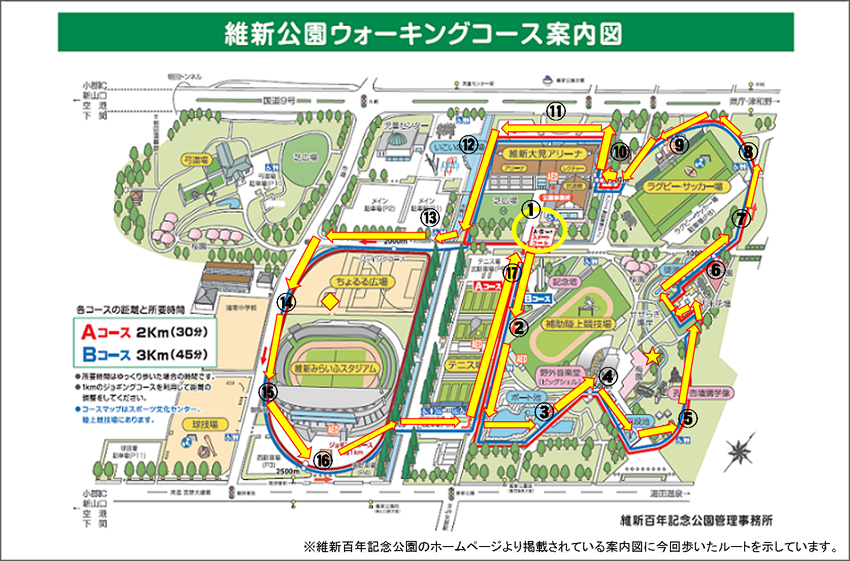 ※下地図は維新百年記念公園のホームページに記載されている案内図に、今回歩いたルートを表示しています。