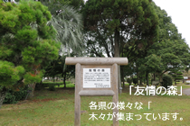 途中、いろんな種類の木がある場所を発見。「友情の森」と書かれたこの場所は、昭和61年に開催された建築士会全国大会の際、各都道府県から寄贈された県木で造成されたそうです。暑い日は日陰となりひと休みの場にできそうです。